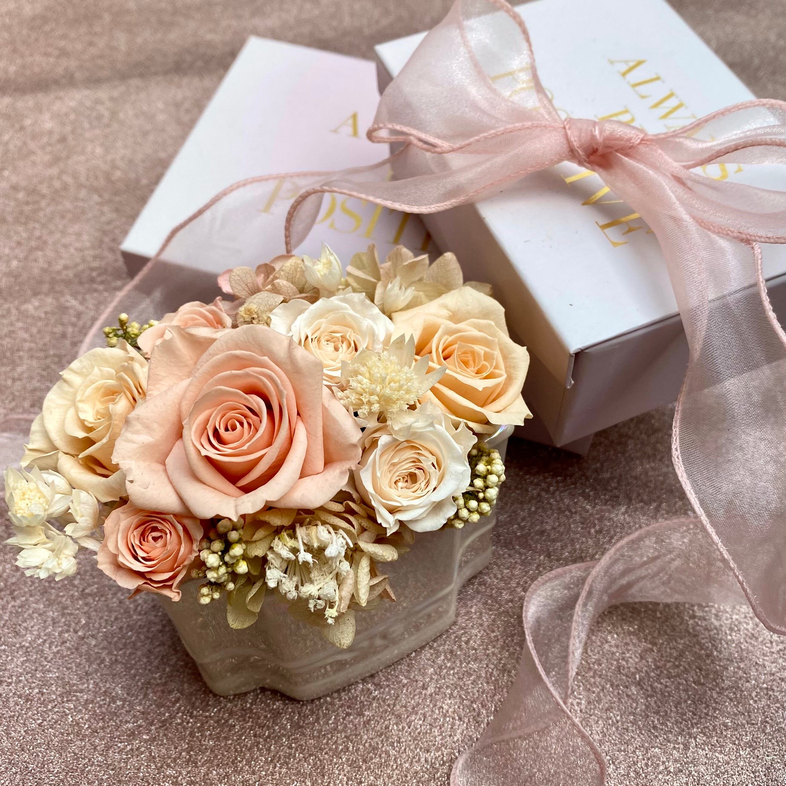優しい印象で小さいながら高級感のあるアレンジメントで贈り物にお勧めです。